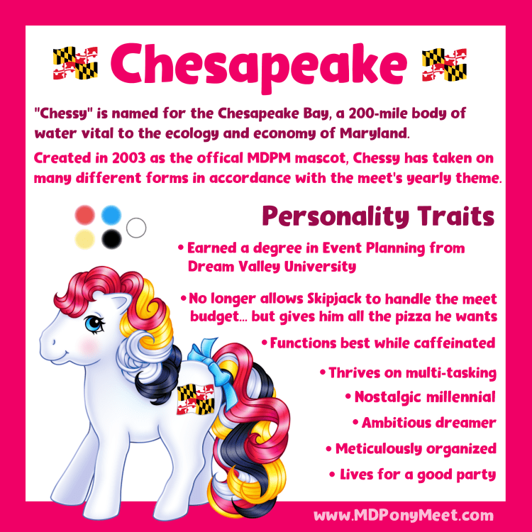 Over the years, Chesapeake (or “Chessy” as coined by meet-goers) took on the form of many different types of ponies to coordinate with that particular year’s theme. She has been drawn as a Flutter pony, Merry-Go-Round pony, Big Brother pony, and many other My Little Pony inspired forms.
